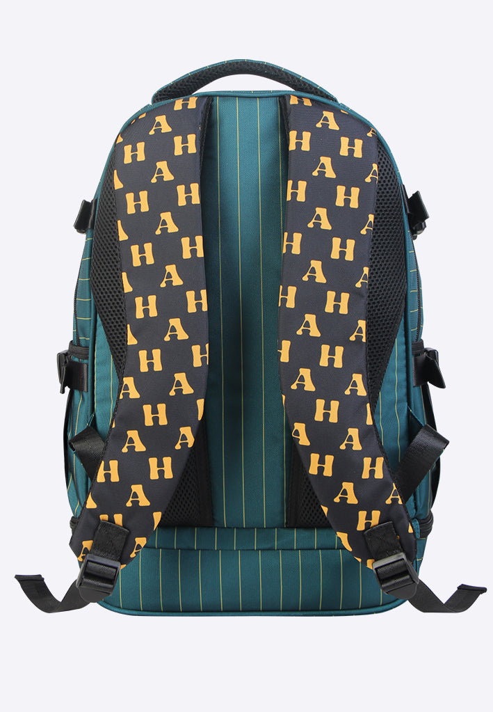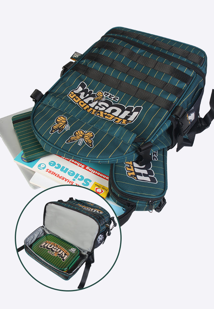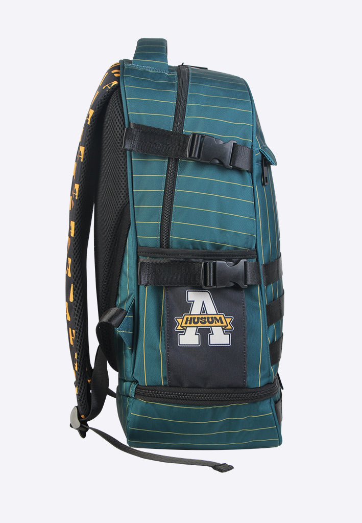 En robust og stilren skoletaske i Husums college-design. Tasken måler 46 x 30 x 13 cm og har hele 5 rum, så der er plads til alt skoleudstyret. Det praktiske kølerum foran hjælper med at holde madpakken frisk, mens den indvendige lomme til tablet eller laptop beskytter dine elektroniske enheder. Side lommer til drikkedunk eller småting gør tasken endnu mere funktionel. Tasken er lavet i slidstærk 100 % polyester – perfekt til den aktive skolehverdag.